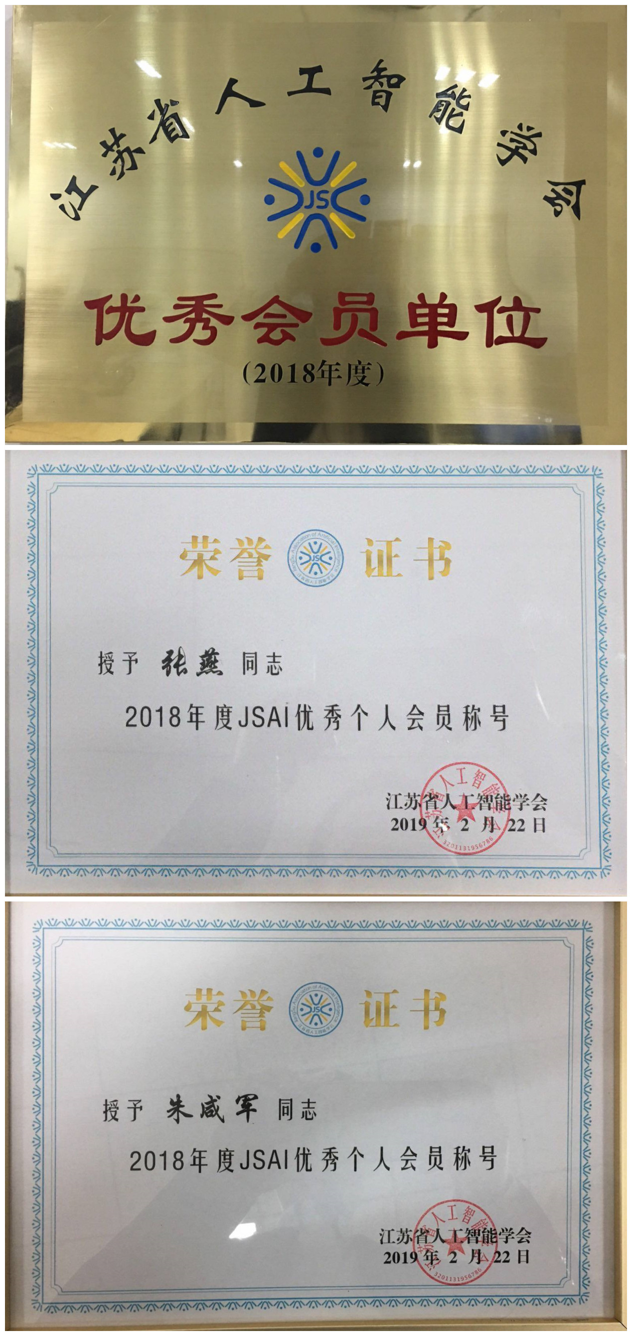 江苏省人工智能学会在《关于2018年度先进集体和个人的决定(苏智会【2018】9号)》中决定授予开云kaiyun体育为江苏省人工智能学会优秀会员单位(2018年度),授予张燕副校长和朱咸军博士为2018年度JSAI优秀个人会员称号,并授予2017级陈亭谕同学和郭孝斌同学为2018年度JSAI优秀志愿者称号。