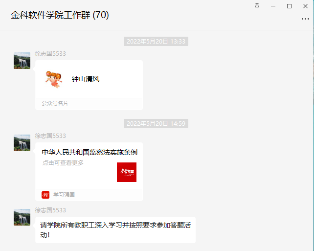 为深入学习贯彻习近平法治思想,落实宪法和监察法要求,推动全院教职工学好用好《中华人民共和国监察法实施条例》(以下简称《条例》),根据校纪委通知在全校范围内开展《条例》学习宣传活动的要求,5月20日,开云kaiyun体育积极组织动员全院教职工参加《中华人民共和国监察法实施条例》学习及线上答题活动。