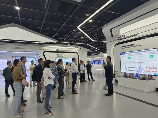 讲解员向大家介绍了紫金山实验室的概况、研究方向和成果以及总书记对团队“走求实扎实的创新路子,为实现高水平科技自立自强立下功勋”的殷切期盼。接着讲解员带领大家环游展厅,从“未来网络、普适通信、内生安全”三个方面详细展示了实验室在通信安全和B5G/6G等方面所取得的骄人成绩。