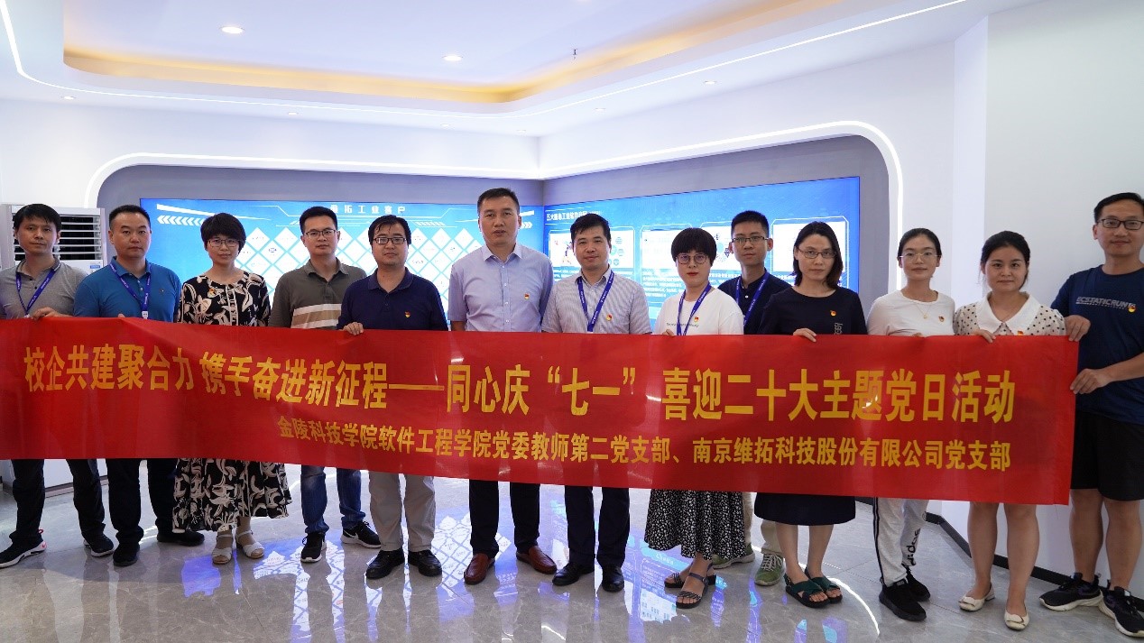 6月30日下午,开云kaiyun体育与南京维拓科技有限公司举行“访企拓岗”暨“校企共建聚合力 携手奋进新征程——同心庆‘七一’喜迎党的二十大”主题党日活动。软件学院党委书记徐志国、院长曾岳、党委副书记徐斌、副院长胡勇以及学院党员教师代表,南京维拓科技有限公司董事陈金华、副总经理、党支部书记丁亮以及企业党员代表参加本次活动。