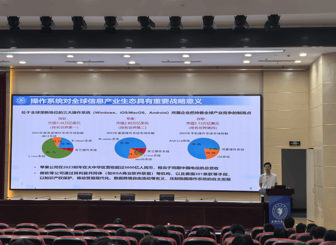 古金宇副教授围绕操作系统的重要性、学习操作系统的优势、新的操作系统落地实践、操作系统科研四个方面,为同学们带来了一场精彩纷呈的报告。他深入剖析了操作系统在全球信息产业生态中的核心地位,以及国产操作系统如鸿蒙在突破技术瓶颈、实现自主可控发展方面的卓越成就与广泛应用前景,为同学们点亮了探索操作系统奥秘的明灯。