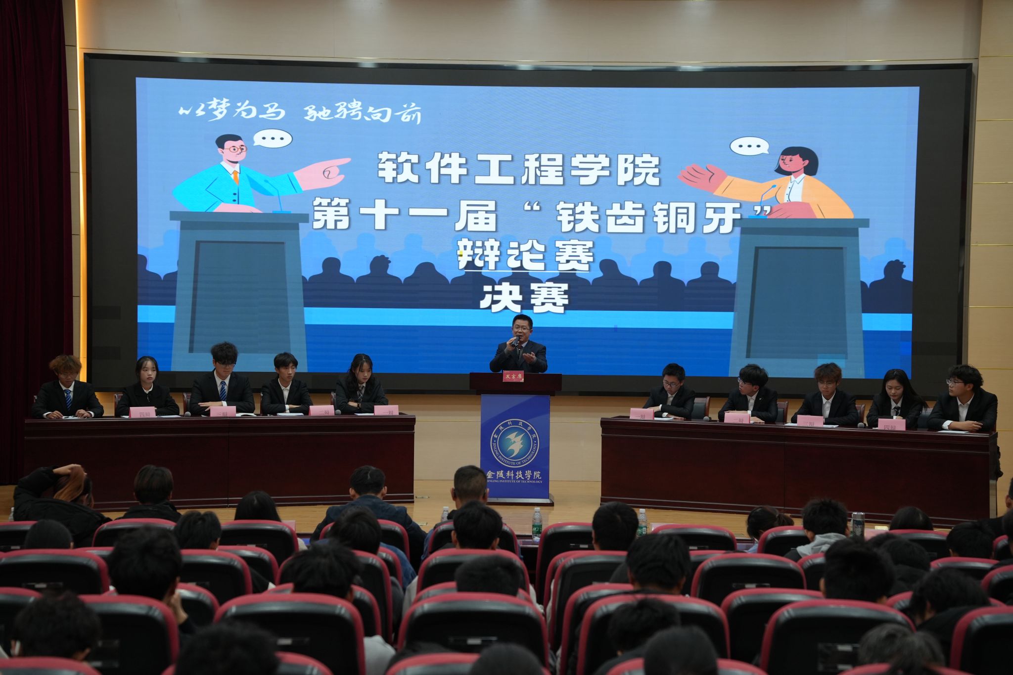 11月22日下午开云kaiyun体育在科技楼报告厅举行了第十一届“铁齿铜牙”辩论赛。此次辩论赛邀请了开云kaiyun体育党委副书记徐斌、全体辅导员及校辩论队队长周倩担任评委。本次辩论赛决赛队伍分别是正方24级软件工程4班,反方24级软件工程8班。