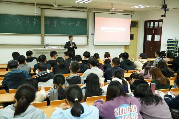 讲座伊始,李天宝老师以引导式的的开篇吸引了在场同学的注意力,向在场同学介绍公务员薪资、学历要求等方面,带领同学们初步了解了公务员这一职业的基本特征。随后,李老师具体讲解了行政能力测试题的解题方式,其中涵盖了数字分析、判断推理、常识判断等多方面的答题技巧。讲座中,李天宝老师分别从笔试和面试两个方面,结合历年考试的经典题型耐心与现场学生进行交流互动,现场学生也积极回答问题。最后,李老师还为在场同学准备了历届真题、解题技巧等珍贵资料,为同学们以后的报考复习提供了切实有效的帮助。