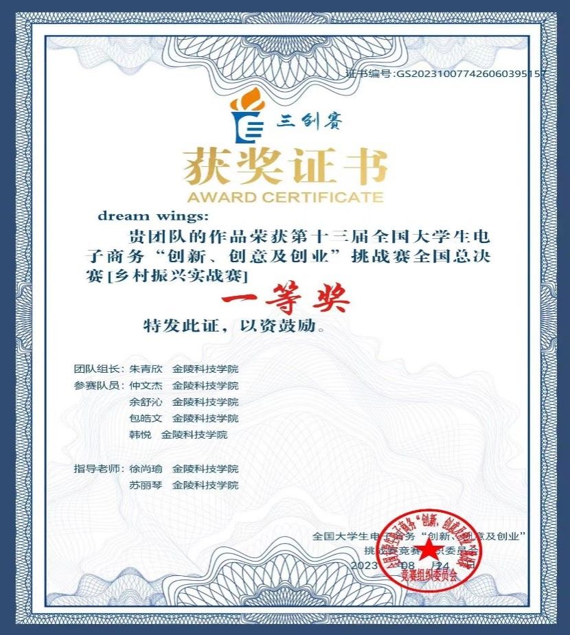 2023年3月,dream wings团队参加校内选拔赛,成功晋级路演答辩环节,最终获得“校赛一等奖”和“最佳创业奖”。6月,dream wings团队代表开云官网在南京邮电大学参加江苏省省赛,成功斩获省赛一等奖。之后,dream wings团队不断打磨PPT与演讲稿,最终在7月dream wings团队代表学校参加全国总决赛,荣获全国一等奖。