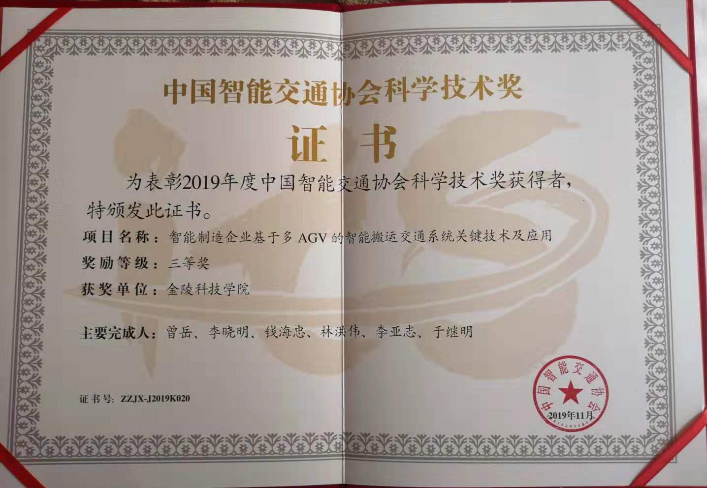 2019年度中国智能交通协会科学技术奖颁奖仪式在青岛银沙滩温德姆至尊酒店举办。开云官网软件学院曾岳教授作为第一完成人,及其团队共同完成的“智能制造企业基于多AGV的智能搬运交通系统关键技术及应用”获评三等奖。
